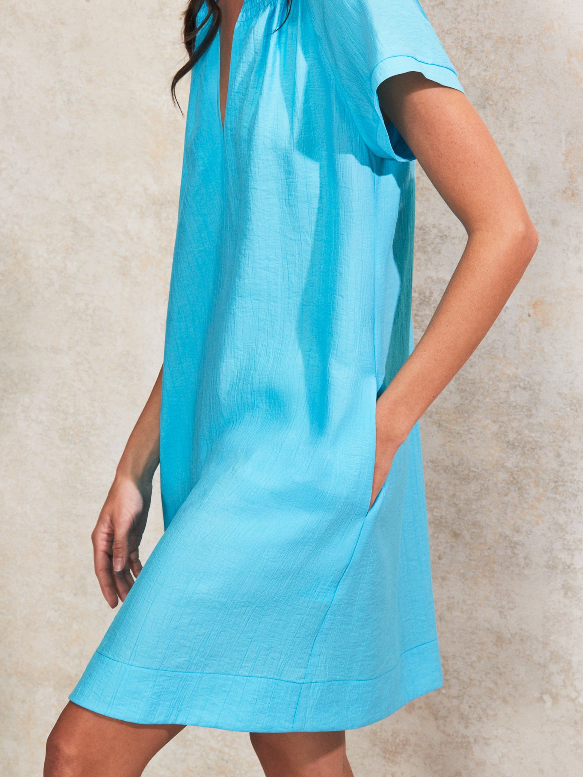 On balmy summer days, throw on this easy-breezy dress. It¡¯s designed for an effortlessly relaxed fit, with a simple, short-sleeved, V-neck silhouette that is elevated by gentle gathering at the yoke. It makes for the perfect beach cover-up, but looks equally chic styled with sandals and a basket bag for daytime excursions.