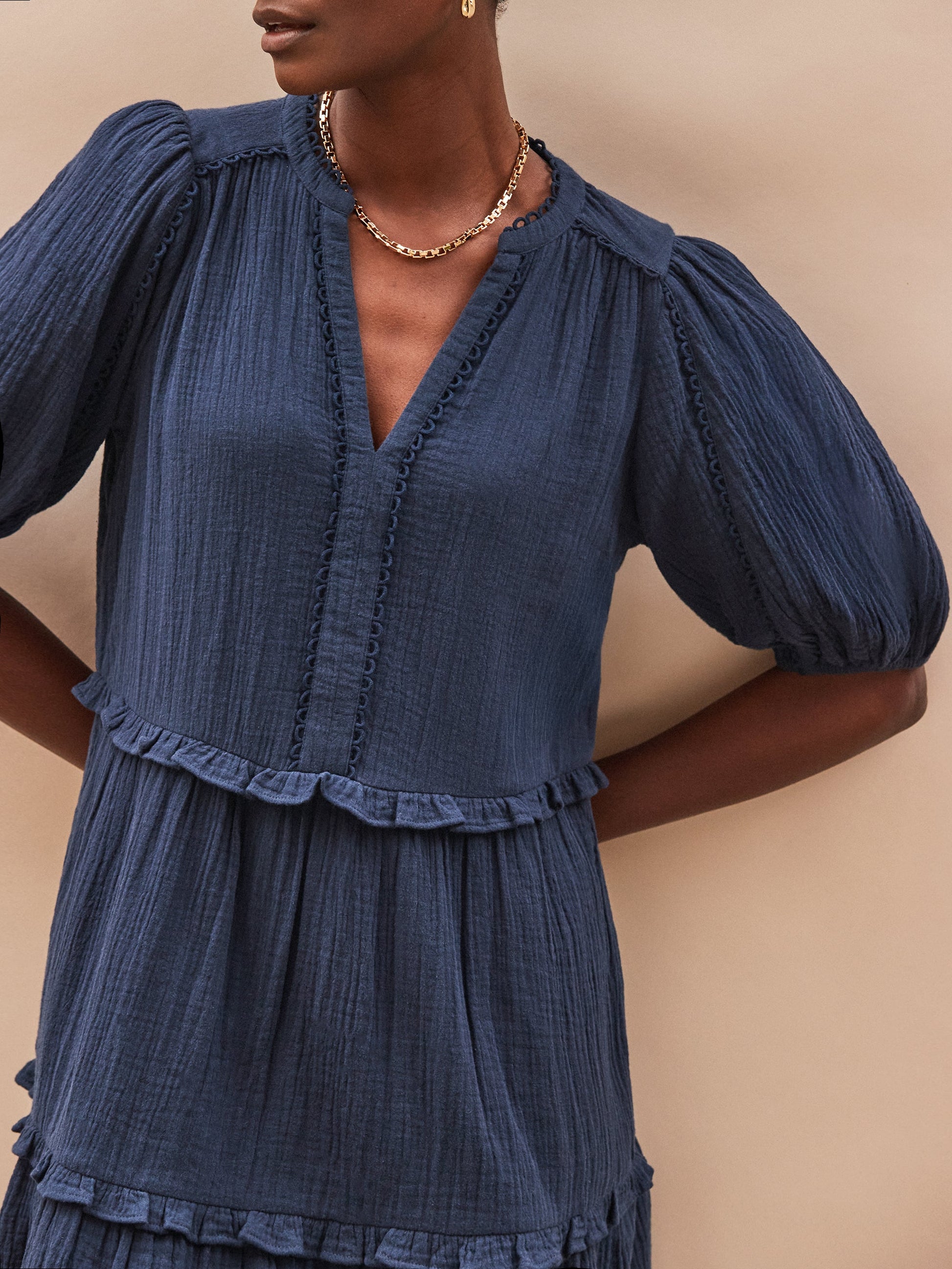 In breezy navy cotton cheesecloth, this mini dress is made for summer weekends. It has so many beautiful details, from the gathered yoke and puffed sleeves, to the ruffle-adorned tiers. Throw it on with ballet flats or heels, making use of the V-neckline show off a favourite necklace or two. This dress is part of our Petite collection.